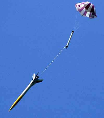 Ich hab mal so ein Modell von Estes gehabt (s.u.), was mit dem Rear Ejection Prinzip geflogen ist. Sehr spektakulär ware dann Flüge mit langen Delays...z.B. C6-7. Wenn alle glaubten, jetzt gibts einen Lawn Dart ging der Schirm auf und kam auch noch hinten raus! wink